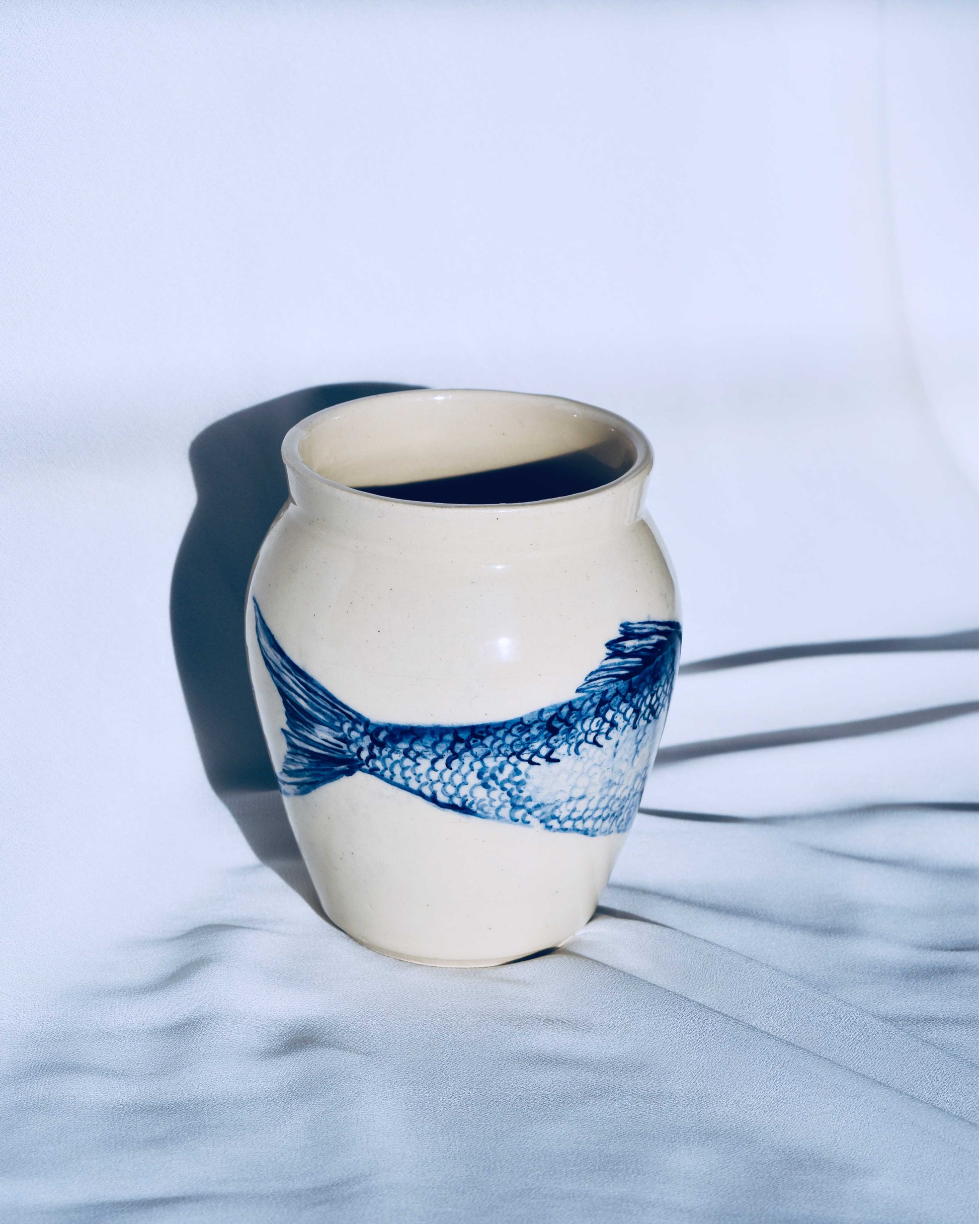 The intricate hand-painted fish design in rich ultramarine blue creates a striking contrast against the white stoneware clay. Use it for small flowers or let it stand alone as a beautiful centrepiece.