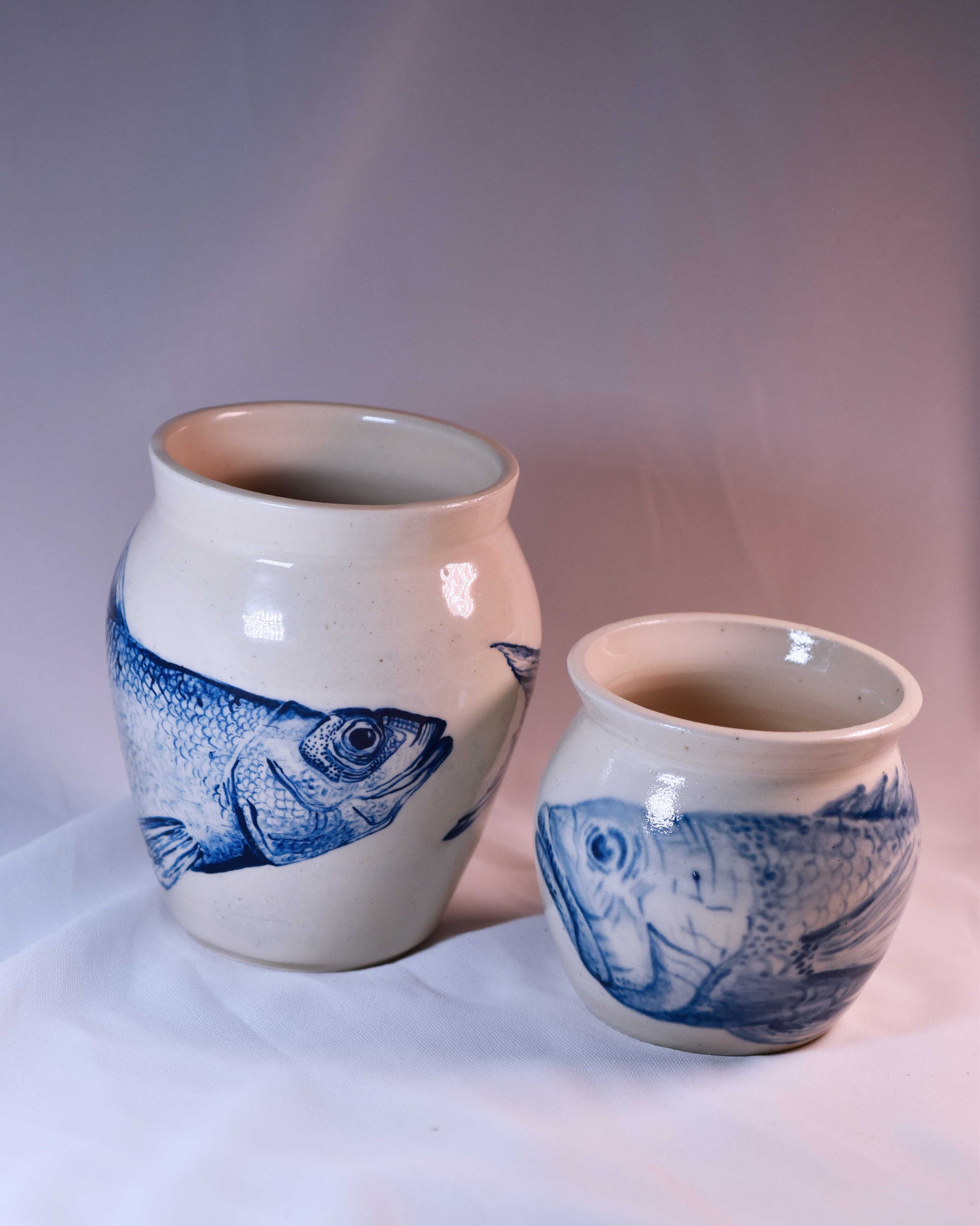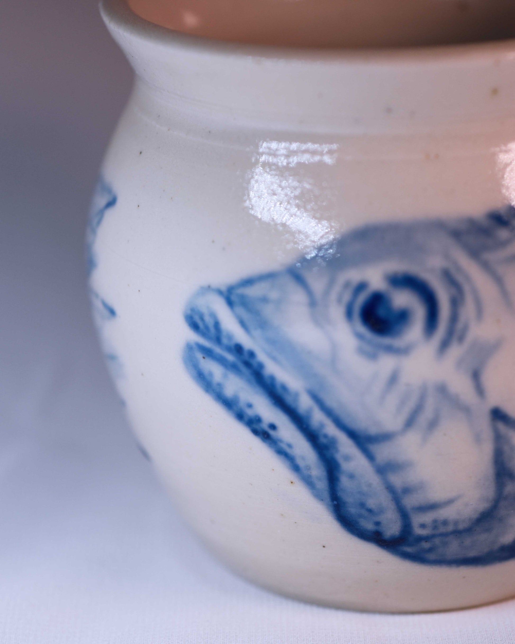 This charming ceramic vase brings aquatic whimsy to any shelf. Hand-crafted from white clay and adorned with a delightfully detailed fish illustration, this piece bears the unique character of kiln-fired glazing that softly blurs the artwork. Its rounded, squat silhouette makes it a perfect petite accent for plant lovers and art collectors alike.