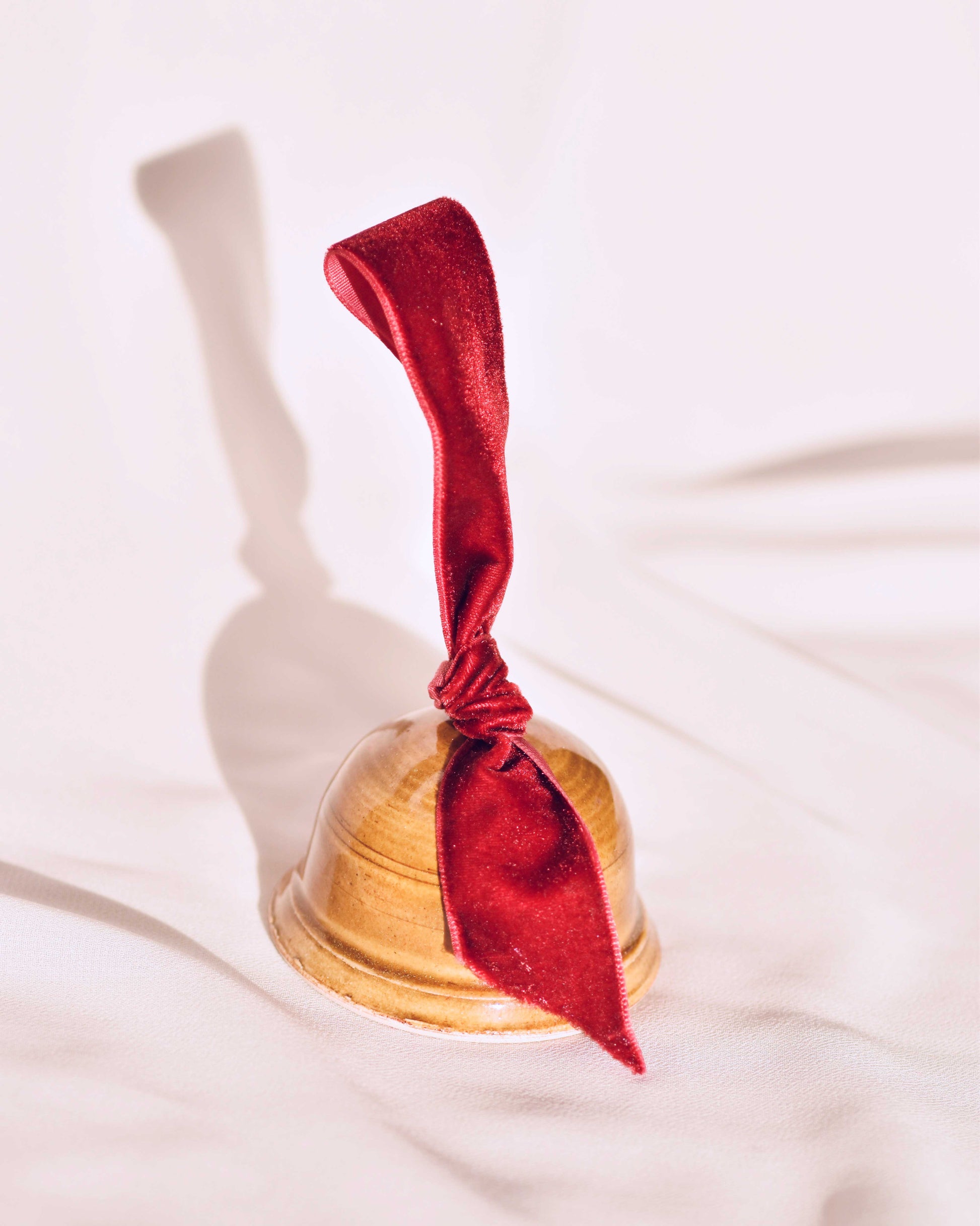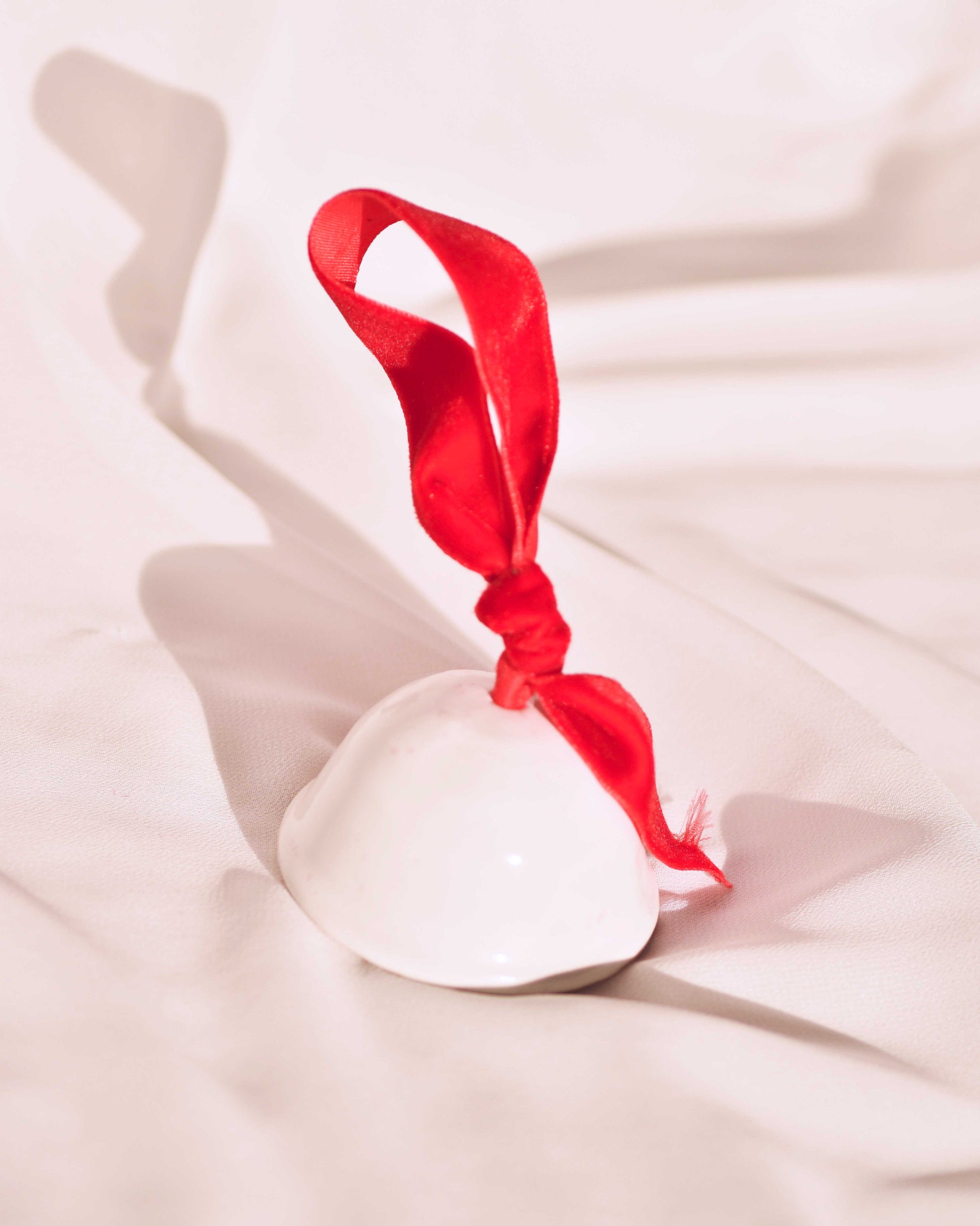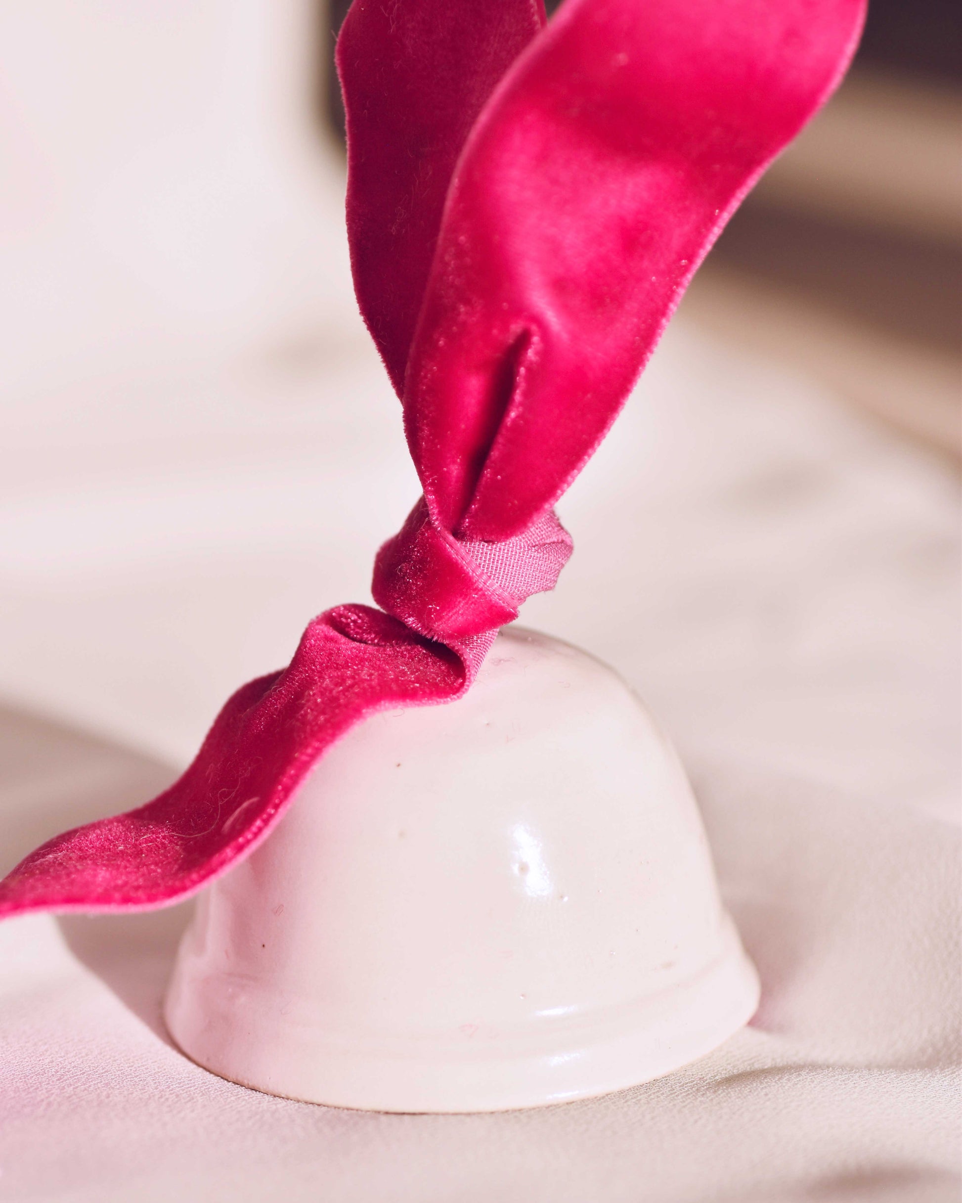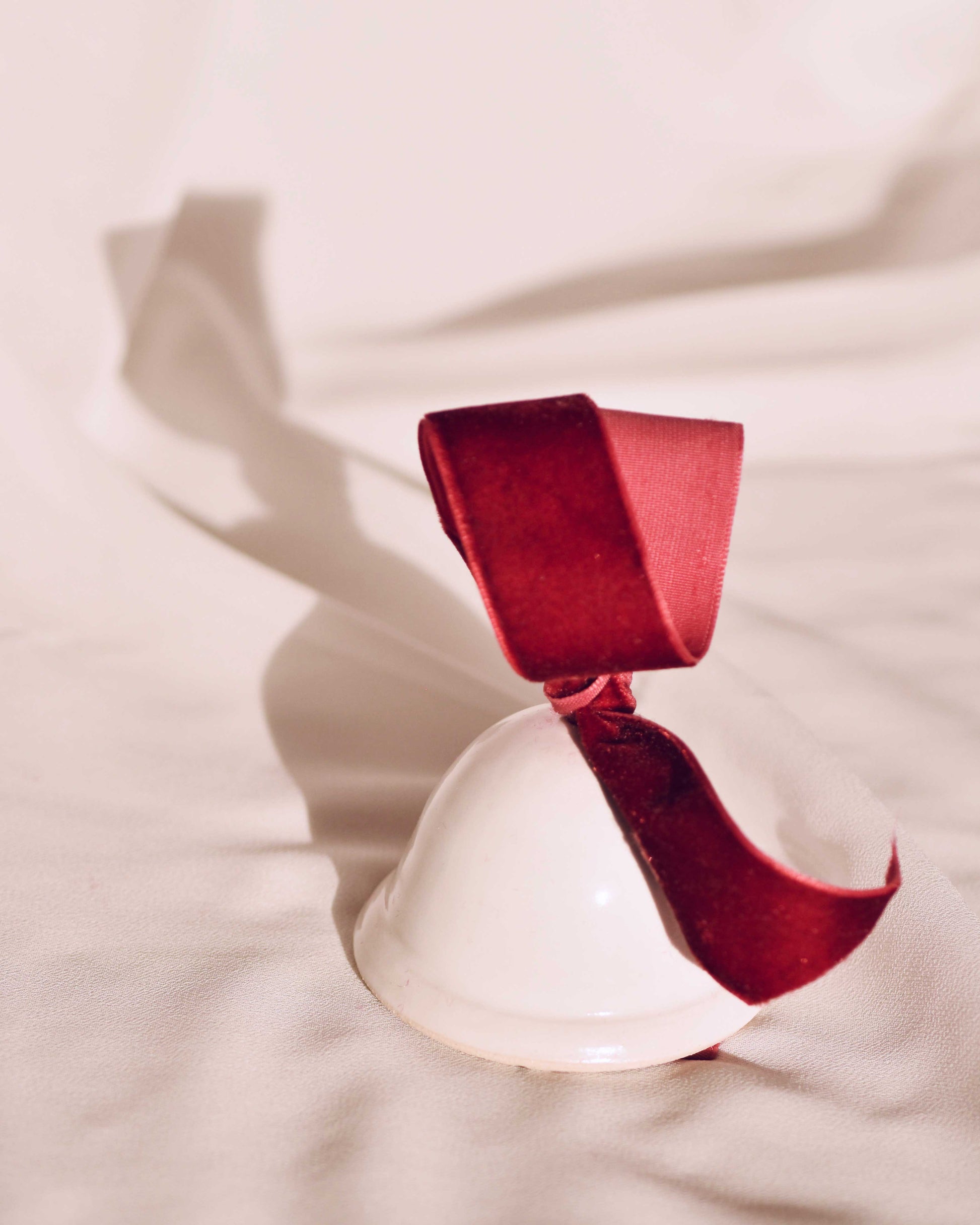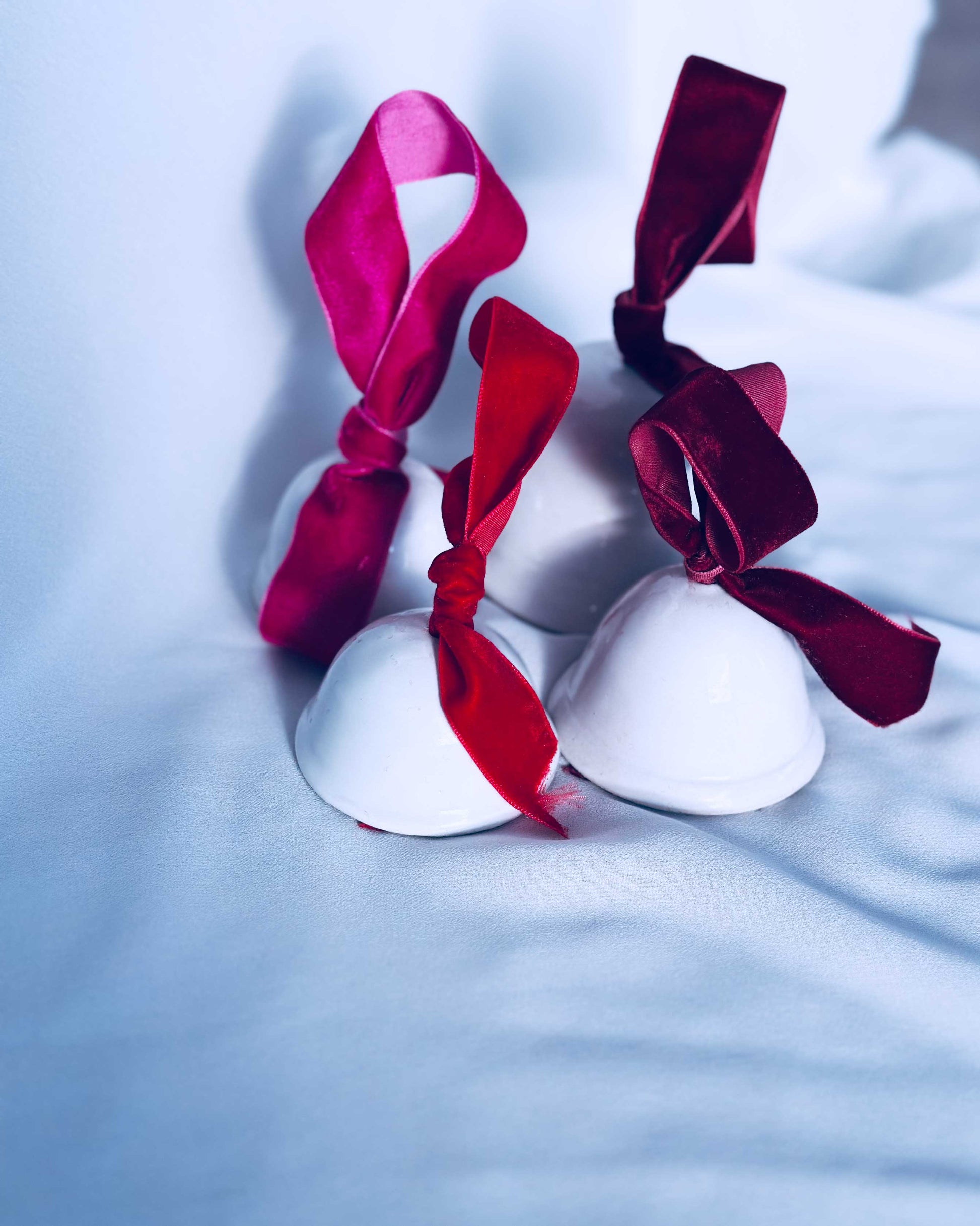 Snowdrop ceramic bells, hand made on the wheel with an polished agate bead clapper and velvet ribbon.